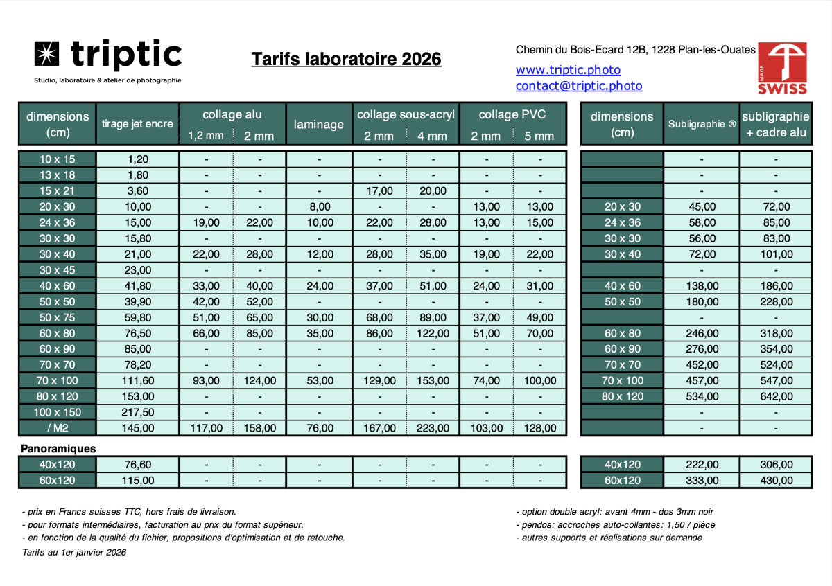 Voici nos tarifs au 1er janvier 2026: (vous pouvez également télécharger les tarifs complets dans le PDF qui se trouve en bas de page)